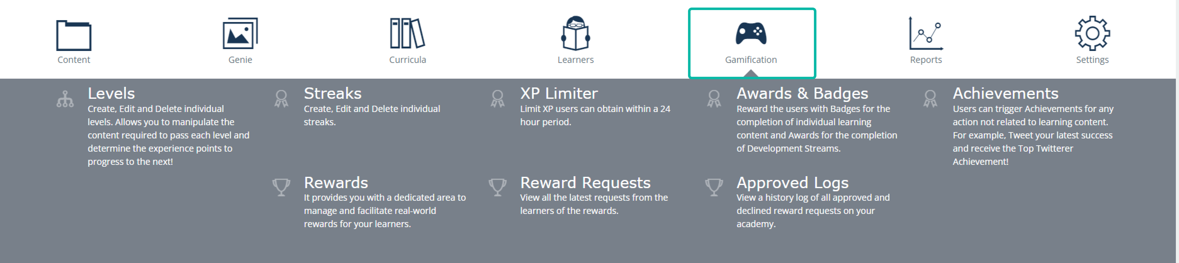 Awards & Badges: In this section, you can create badges and other achievements that can be assigned for content and curriculum