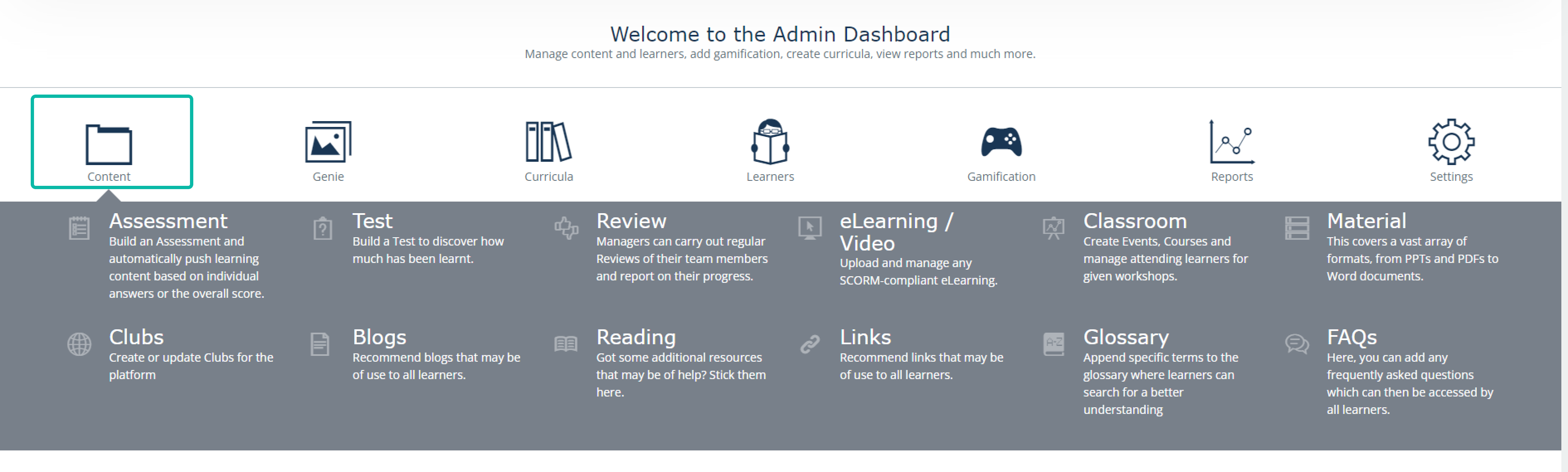 Here Admin can create, edit, upload, and manage different types of LMS content. See our section on Admin content types to learn more about each section: Click here