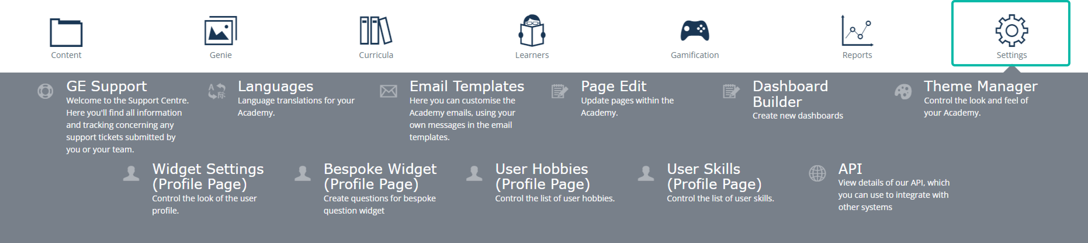 This section helps Admin to establish all necessary platform settings, choose language and theme, build a Learner’s dashboard, manage LMS widgets and, in a nutshell, organize a Learner’s space the most preferable way.