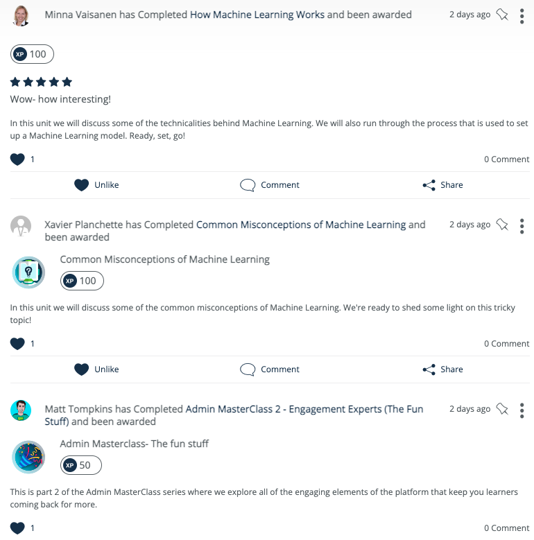 Once the set-up is in place, you can see the learning activity as below. You can also utilise all the normal features of the club such as commenting, liking, replying and tagging.