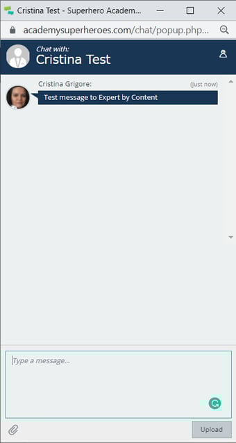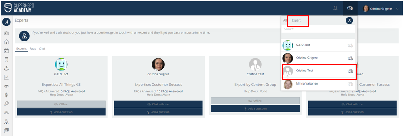 Learners are able to send chat messages to Experts and “Expert by Content”. To do so, the user will go to the Chat area and click on the Experts tab, then choose the Expert or Expert by Content he/she wants to chat to.