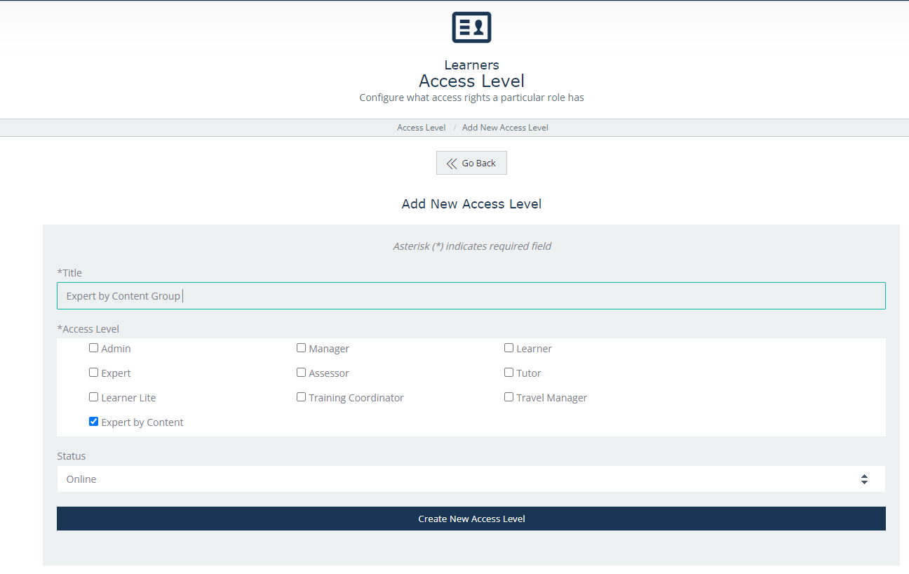 To create an Expert by content group, the admin must go to the Access Level section from the admin Dashboard.