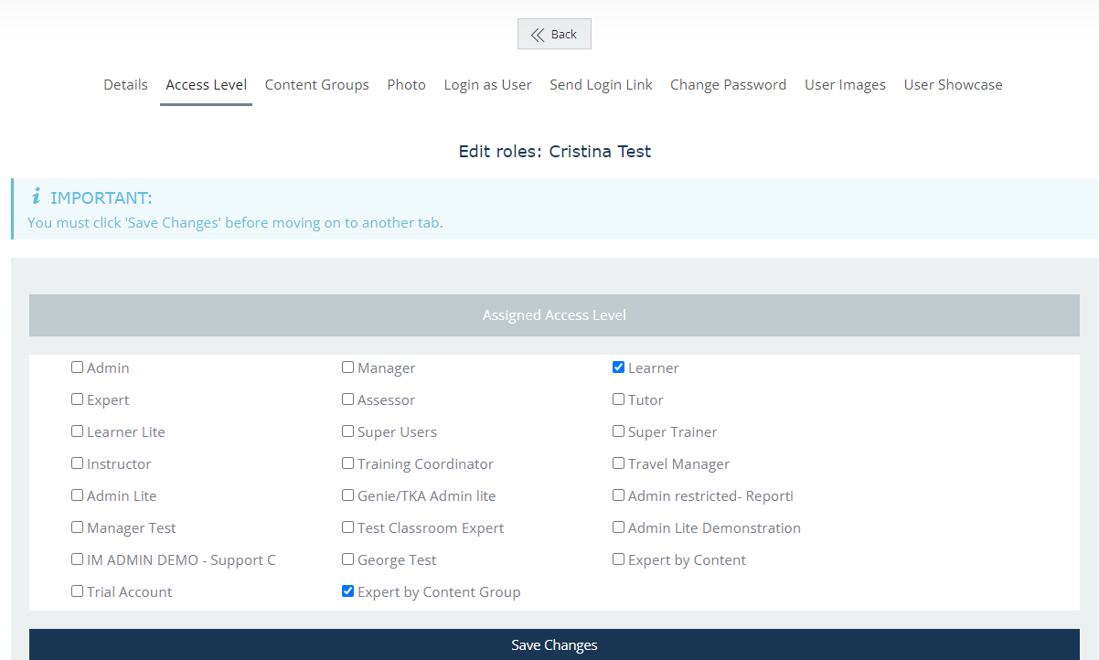 The “Expert by Content” access must be given to the learner/manager/admin that will have the Expert role for the content group.