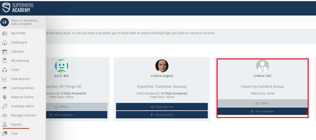 Learners can search for help by sending questions to LMS Experts and Experts by Content, using the Experts functionality on the dashboard sidebar.