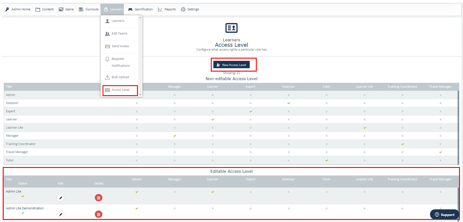 Clicking on “New Access Level”, the admin can create a new editable access level.