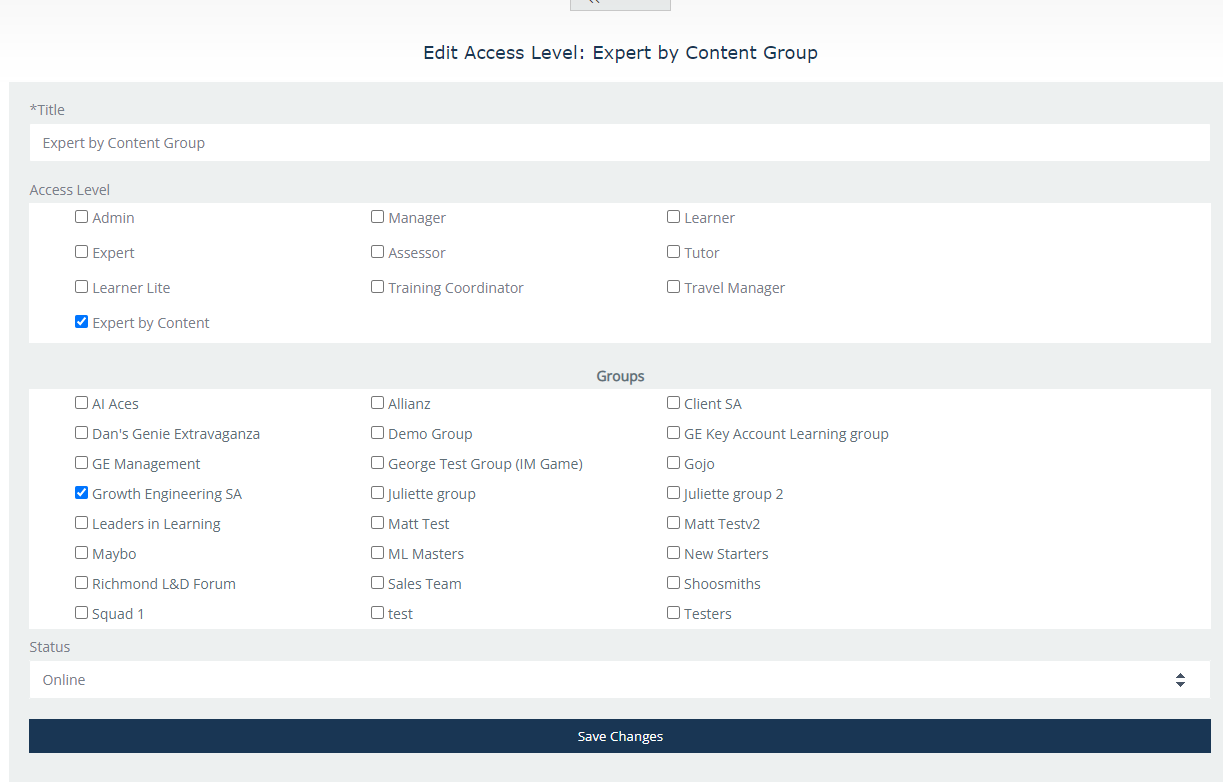 From the Editable Access Level list, select the “Expert by Content” access just created, in order to allocate the content groups. You can see these below the “Groups’ section.