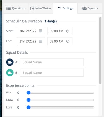 7. Select the settings tab to schedule the battle squad duration, and the squad names and determine the XP amount for win, draw and loss.