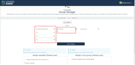 When you click on the Edit Users button, you can add filters to the hierarchy and access levels so it will be easier to find the learners you need to add to the new Content Group.