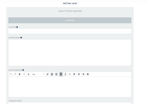 Note: Since levels are designed to show a learner’s progression as they move up their pathway, ensure that the experience points reflect this. Experience points are cumulative. For instance, if for the first level, the experience points required is 100, the next level should be the addition of the first level 100 points and the required points for the next level. E.g. another 100, making 200 points in total for the next level, and so on.