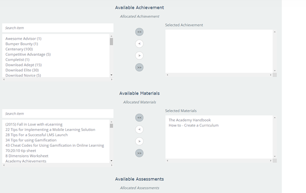 Step 8: Select the learning items you want to be added to the required content by clicking on the content and using the arrow in the middle of the page to move it to the Selected columns.