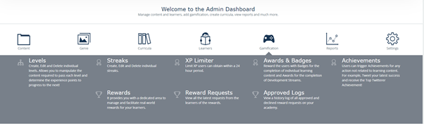 Step 1: From the Admin Dashboard, click on Gamification to view the available options as shown below: