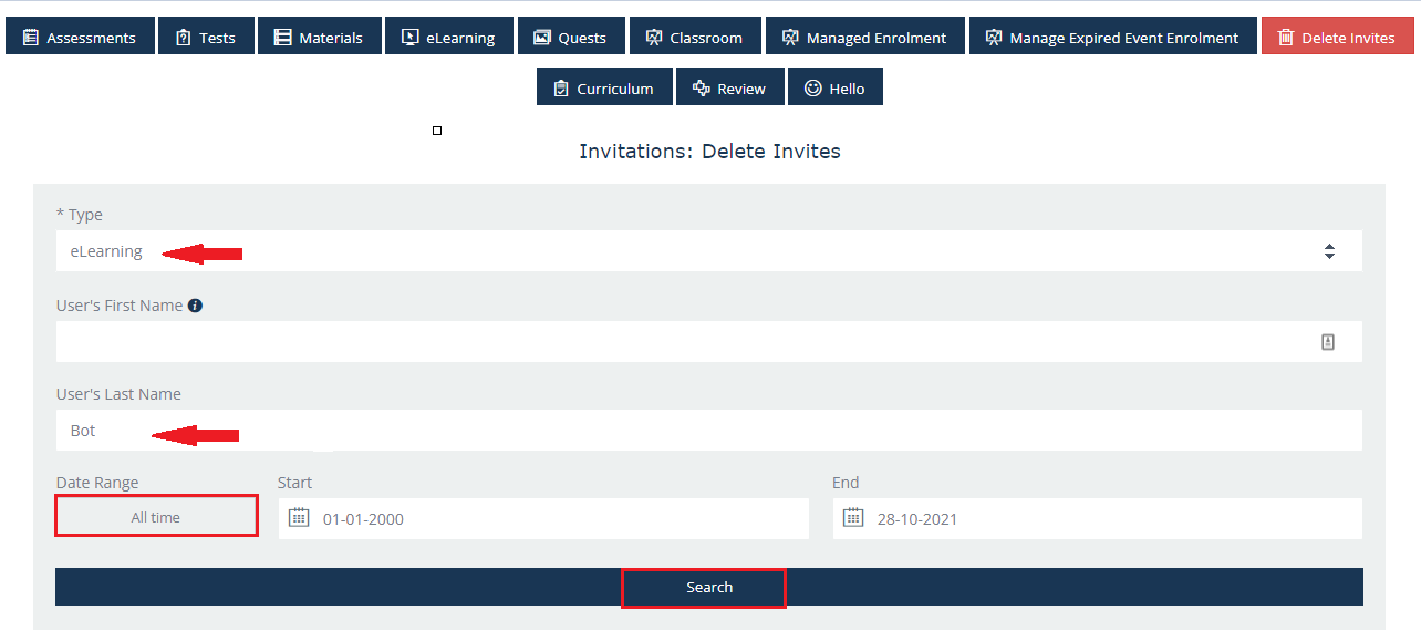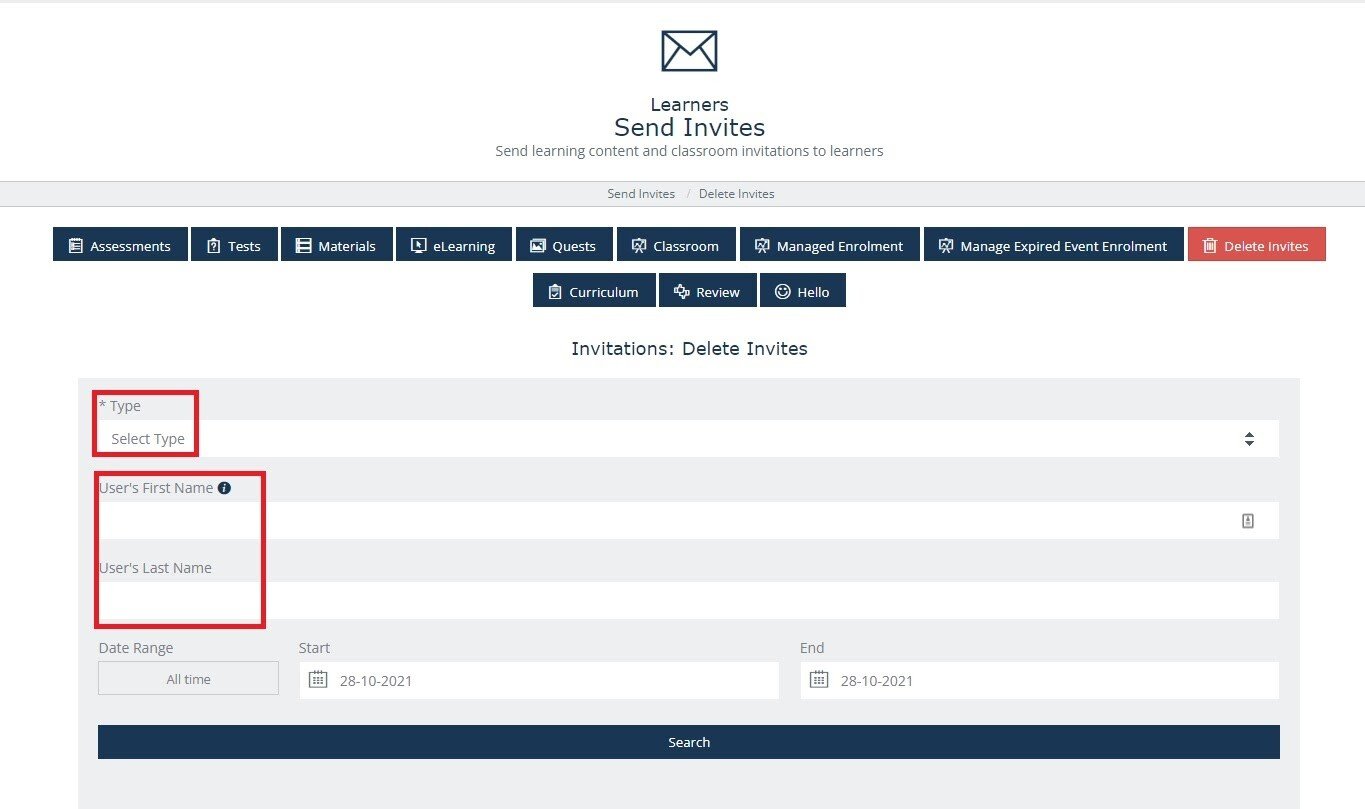 In order to search for the invites, follow the steps below by selecting the content type and the name or surname of the user.