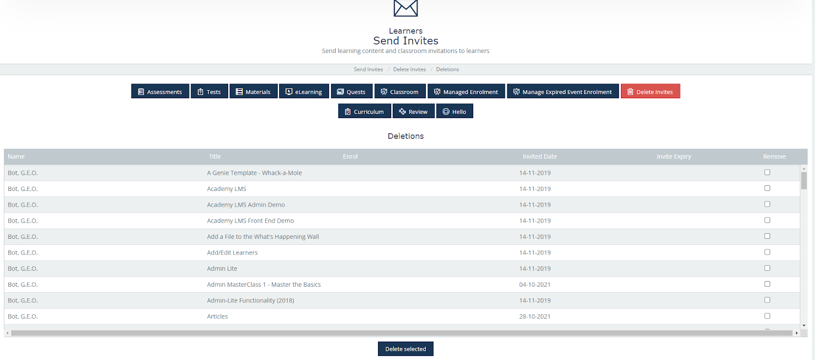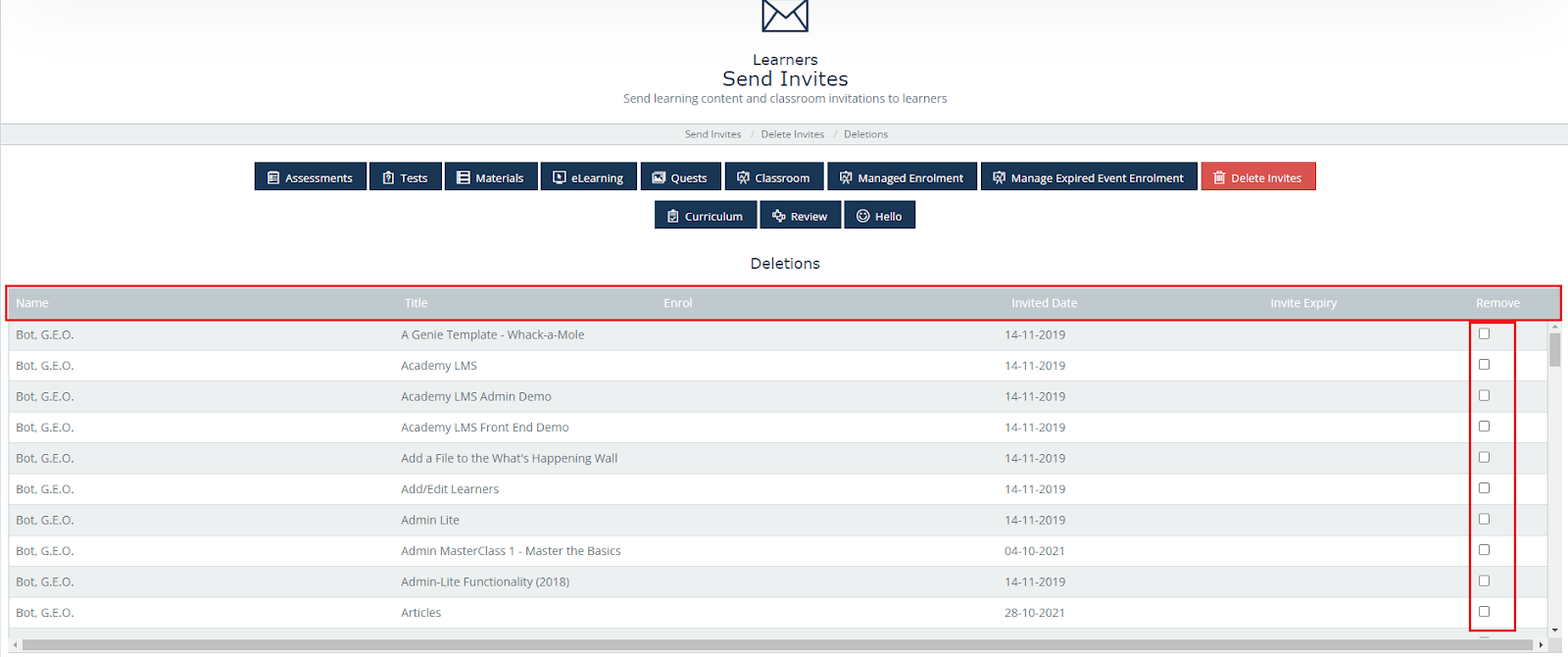 Step 5: The list will all eLearning invitations sent to user G.E.O. Bot will appear.