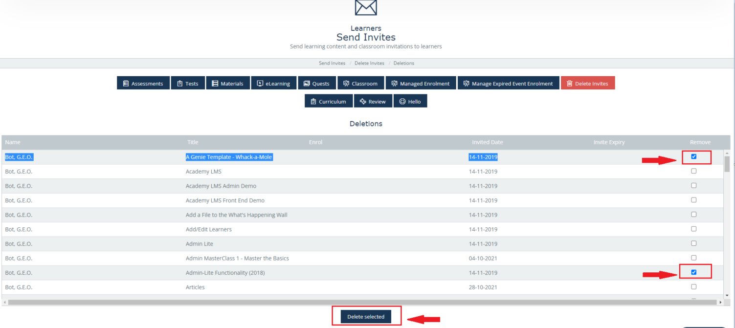 To finish and remove the invitations, click on the ‘Delete selected’ button.