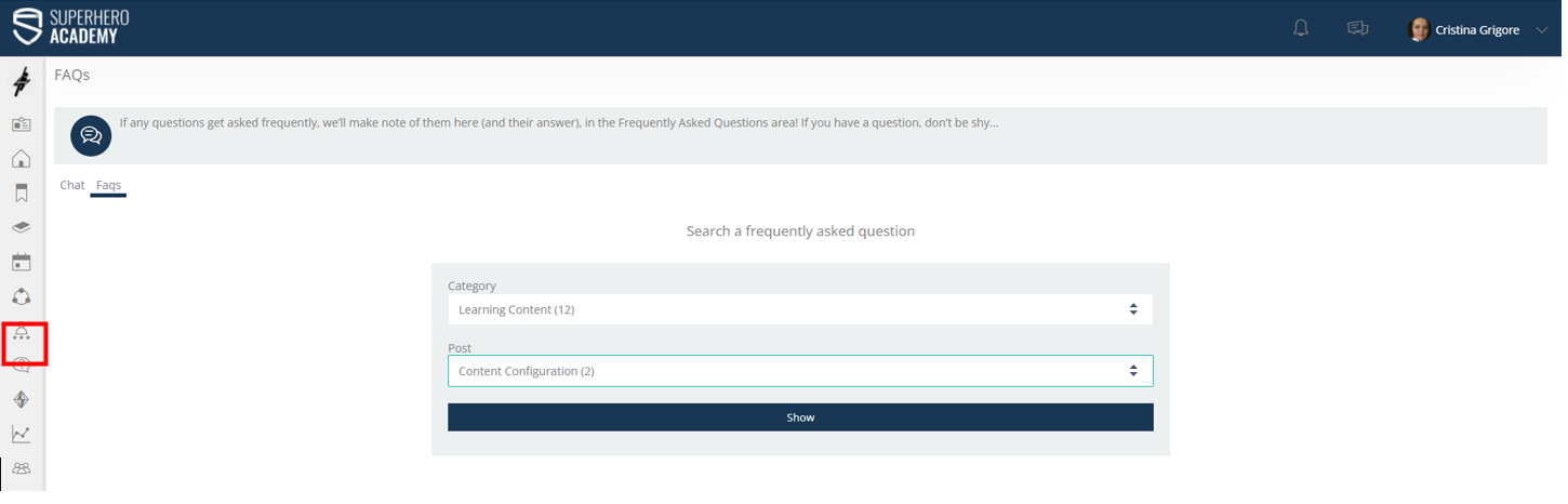 Clicking on the notification, the learner will be directed to the FAQ’s area of the platform. There, the learner can search for the answer.