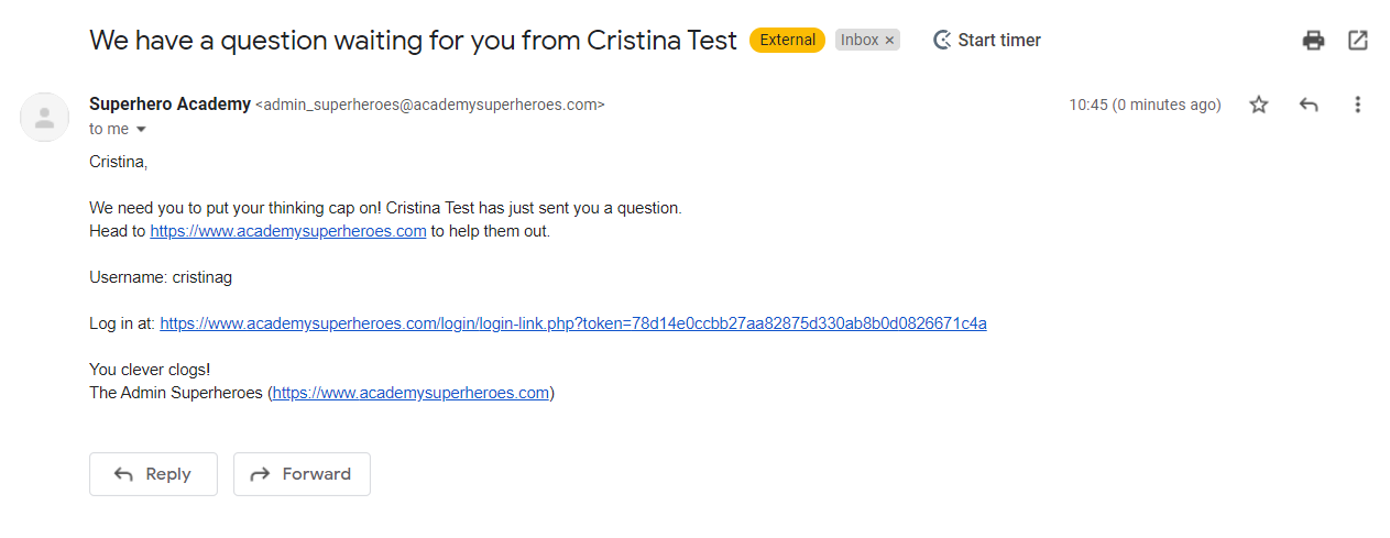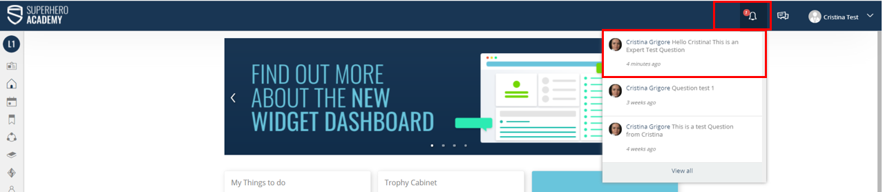 When the Expert has sent the reply to the learner, the learner will receive the answer via email as well as in the LMS through the notification under the Notification Bell