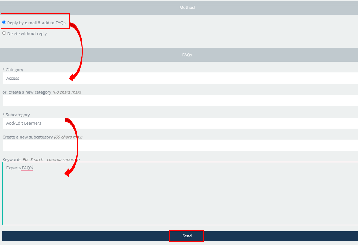 -Selecting “Reply by email & add to FAQ’s” will send an email to the Learner, push a notification under the notification bell and in addition, the Expert can choose to add the answer to the FAQ section under the desired FAQ Category.