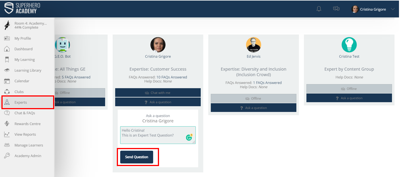 Learners can search for help by sending questions to LMS Experts, using the Experts functionality on the dashboard sidebar.
