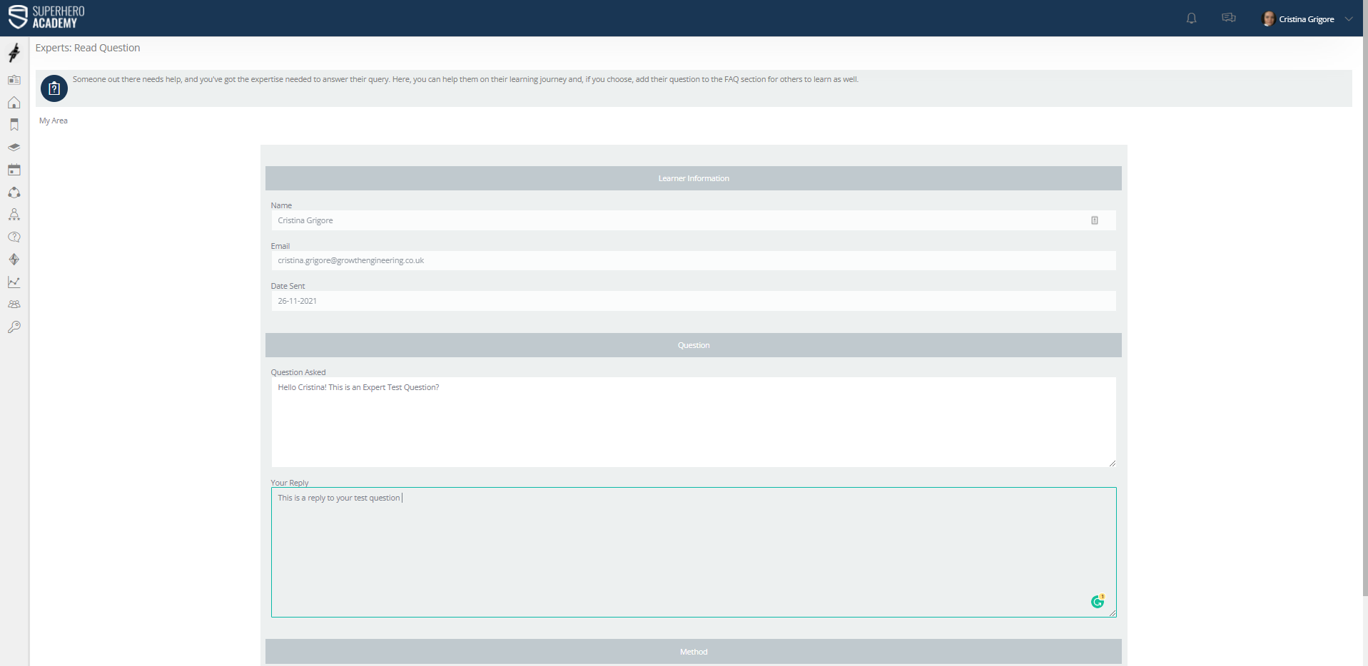This opens up the next page, where the Experts can enter their answer to the learner question.