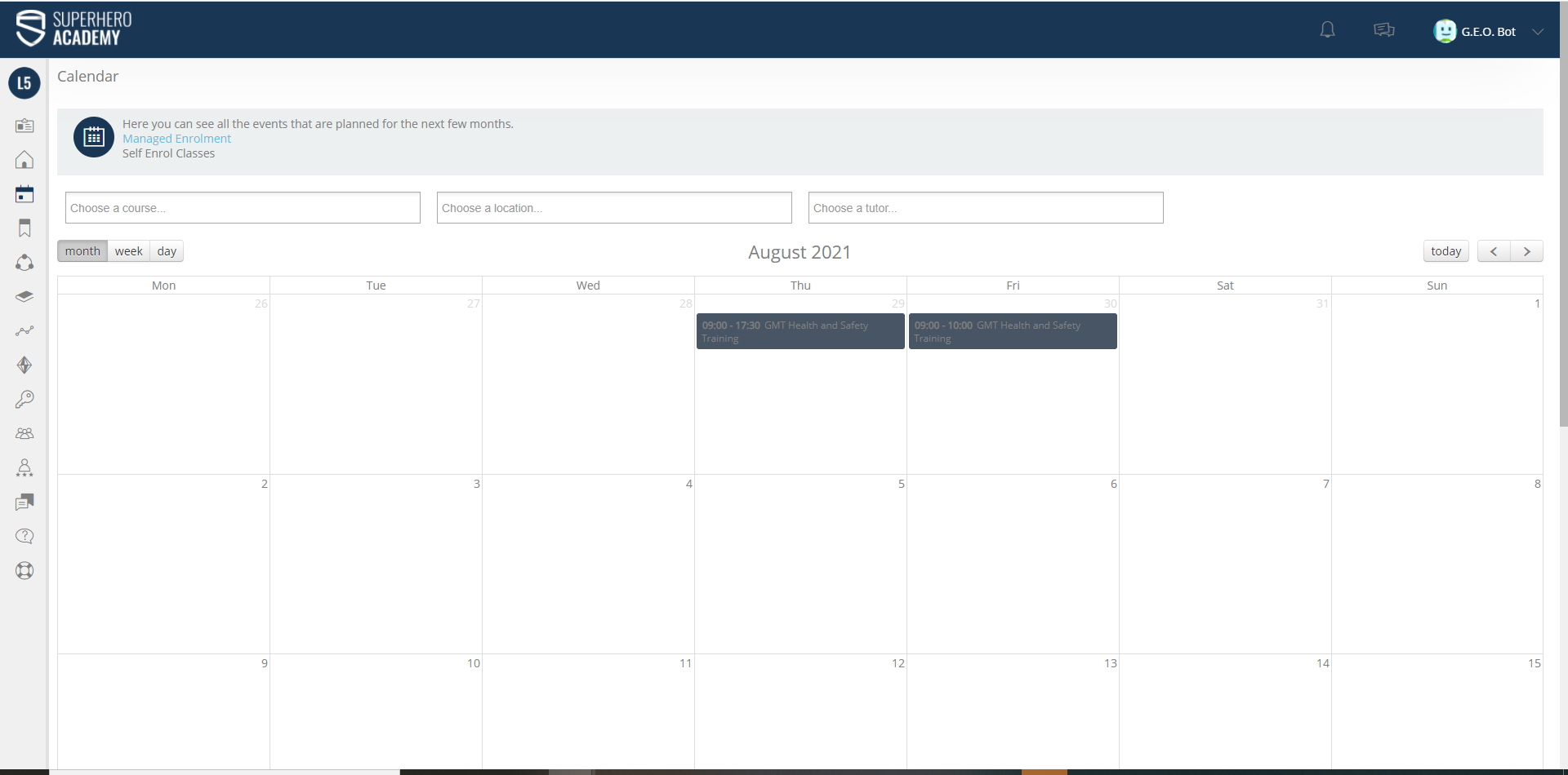 My Calendar is an area for the Learner to view all the events and courses planned for the next few months. This feature is very helpful for organisations looking to implement a blended learning approach.