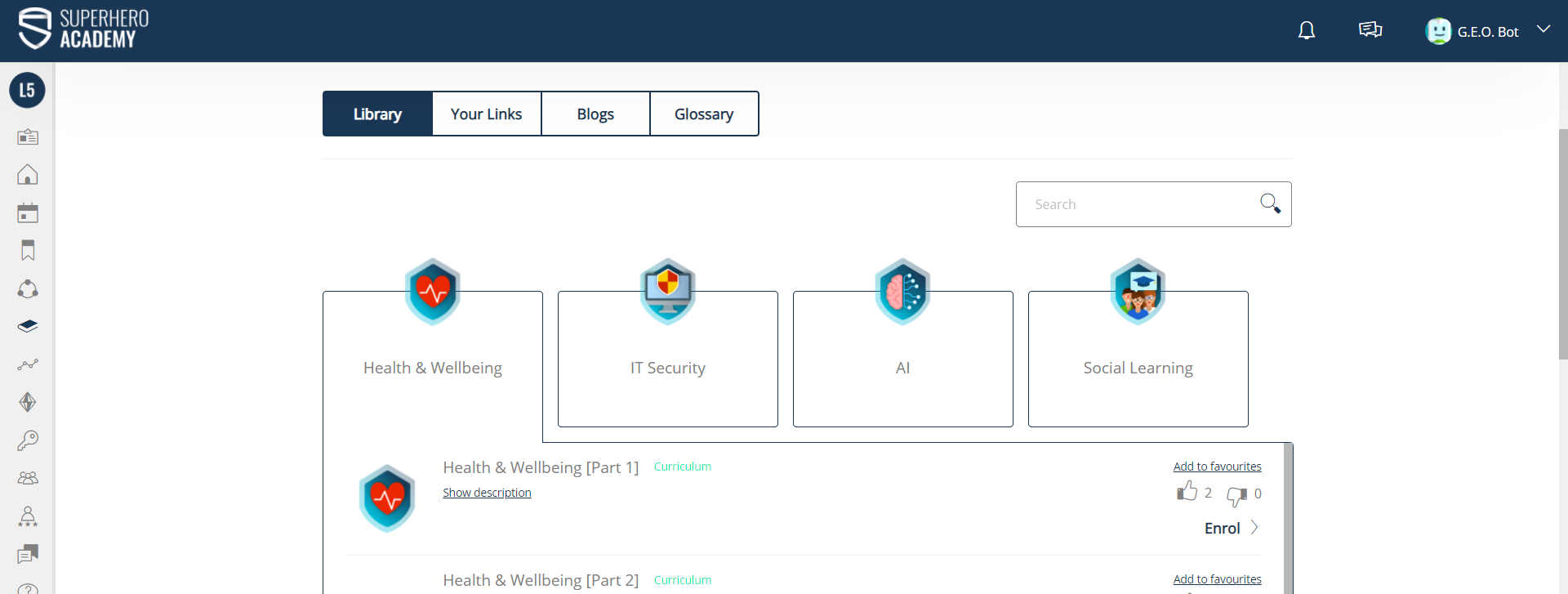 In the Library, Learners will find all of the resources they need to kick-start their professional development. They can browse through the available content or use the search box to find a specific learning item. Content can be organised by sorting it into Categories. Each Category has an icon, when clicked, it will expand into subcategories as shown below. Images can represent the subject of each Category. It’s important to map out your library so that it is easy for Learners to navigate. The images used should all be colour coordinated to make the page visually intuitive.