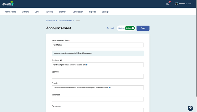 1. Go to Admin Dashboard > Learners > Announcements